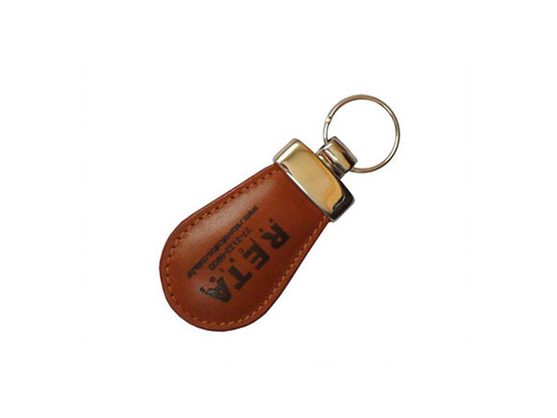 Chaveiro em couro formato em gota, com enchimento, terminal metálico e argola.